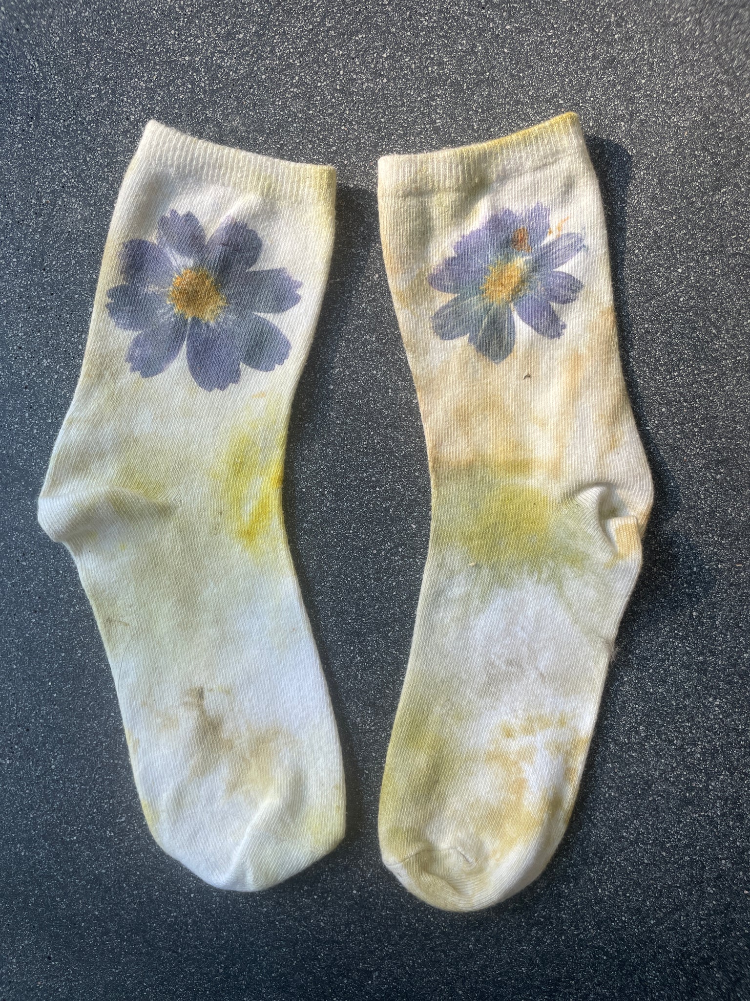 Calcetines 100% algodón, estampados con la técnica de ice dye tie dye con diferentes flores de temporada.