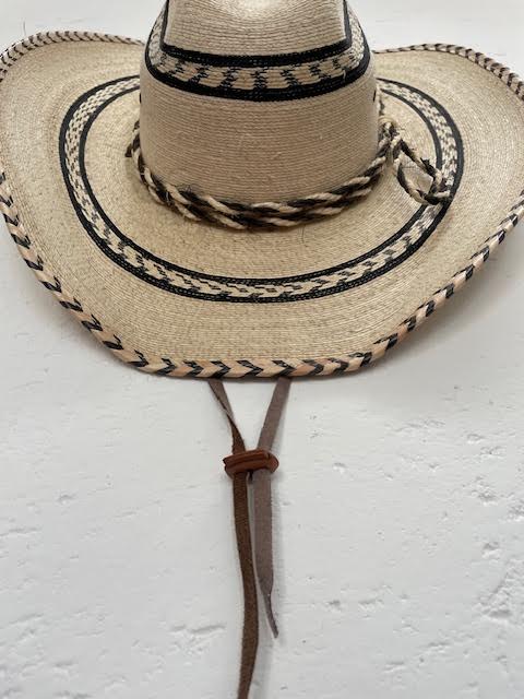 Estilo vaquero, semi rigido. Cordones de piel con contorno de piel en color negro y bordado fino con grecas decorativas. Banda de sudor interna.