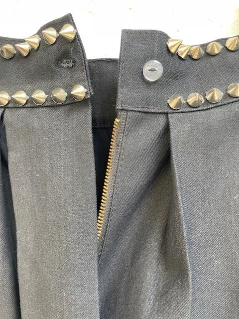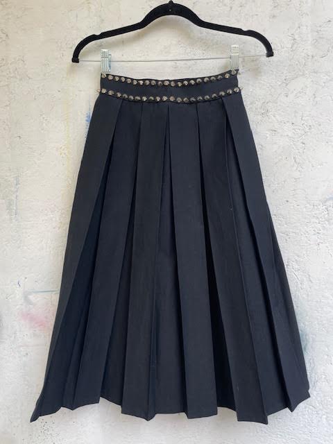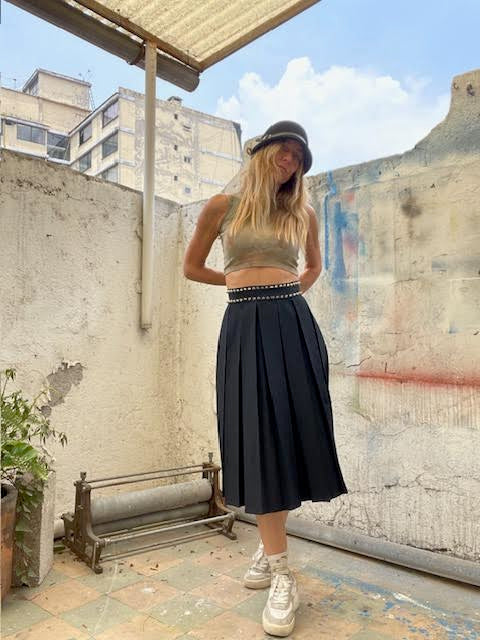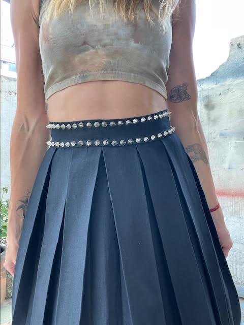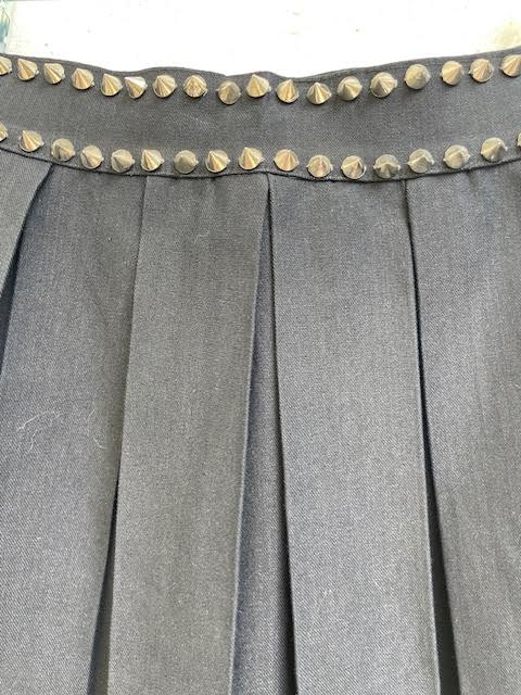 Falda plisada en tono gris oxford con cintura en estoperoles de metal, cierre trasero y altura por debajo de la rodilla.