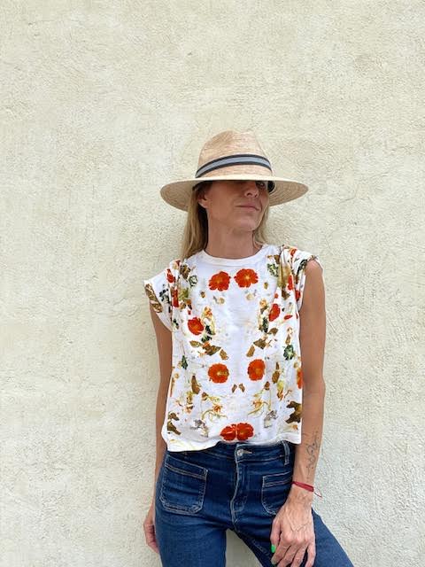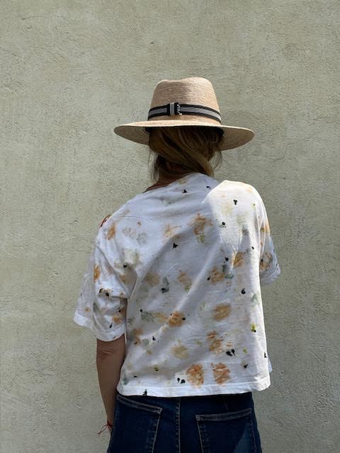 Playera Boxy Cut 100% algodón fino. Hecha con la técnica de estampado botánico creado en la playa, con flores, agua de mar y arena.